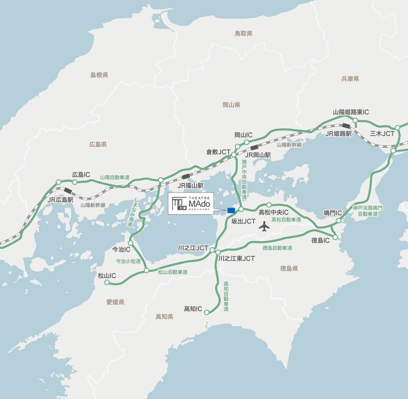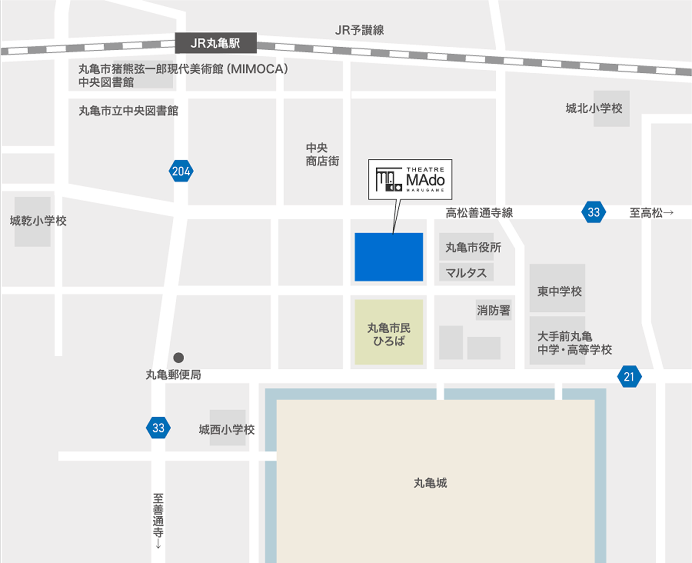 シアター マドTHEATRE MAdo(2026年9月開館予定) 所在地 〒763-0034 香川県丸亀市大手町二丁目3番1号Google Map 開館準備室〒763-0001 香川県丸亀市風袋町209 セントラル丸亀ビル8階 【各交通機関からのアクセス】 JR丸亀駅より徒歩10分
