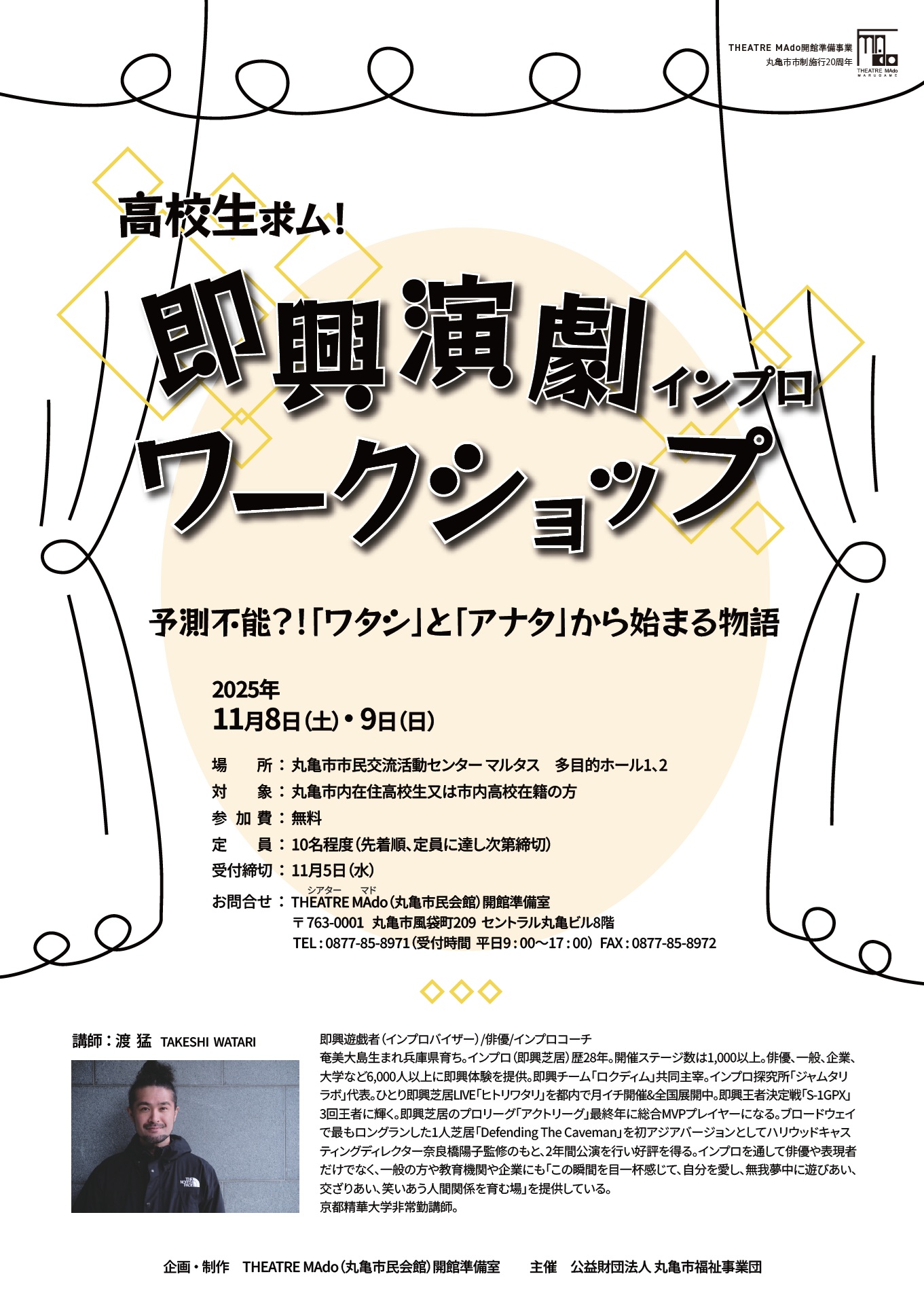 ①本ページ下部のフォームからお申し込み②THEATRE MAdo(丸亀市民会館)開館準備室まで、お電話またはFAXにてお申し込み