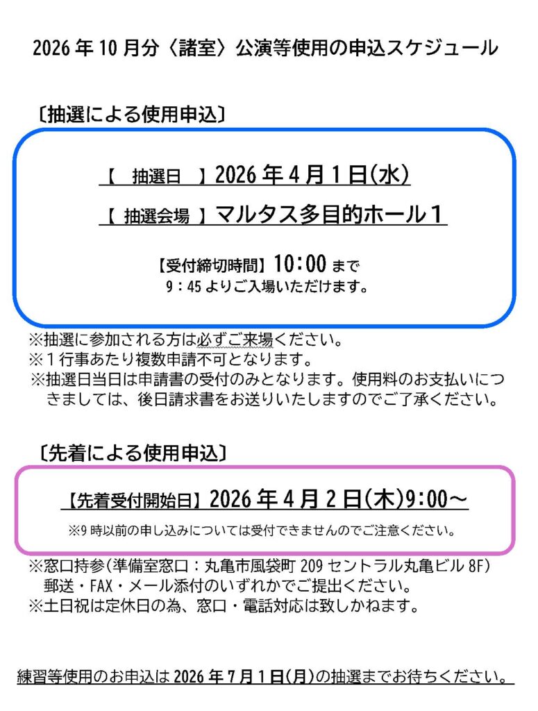 下記施設の2026年10月分の公演等使用 について申込を受け付けます。